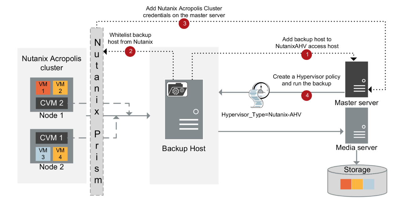 • The NetBackup master server, media server needs to establish communication with the Nutanix Acropolis cluster through a backup host to complete a backup or restore job.
