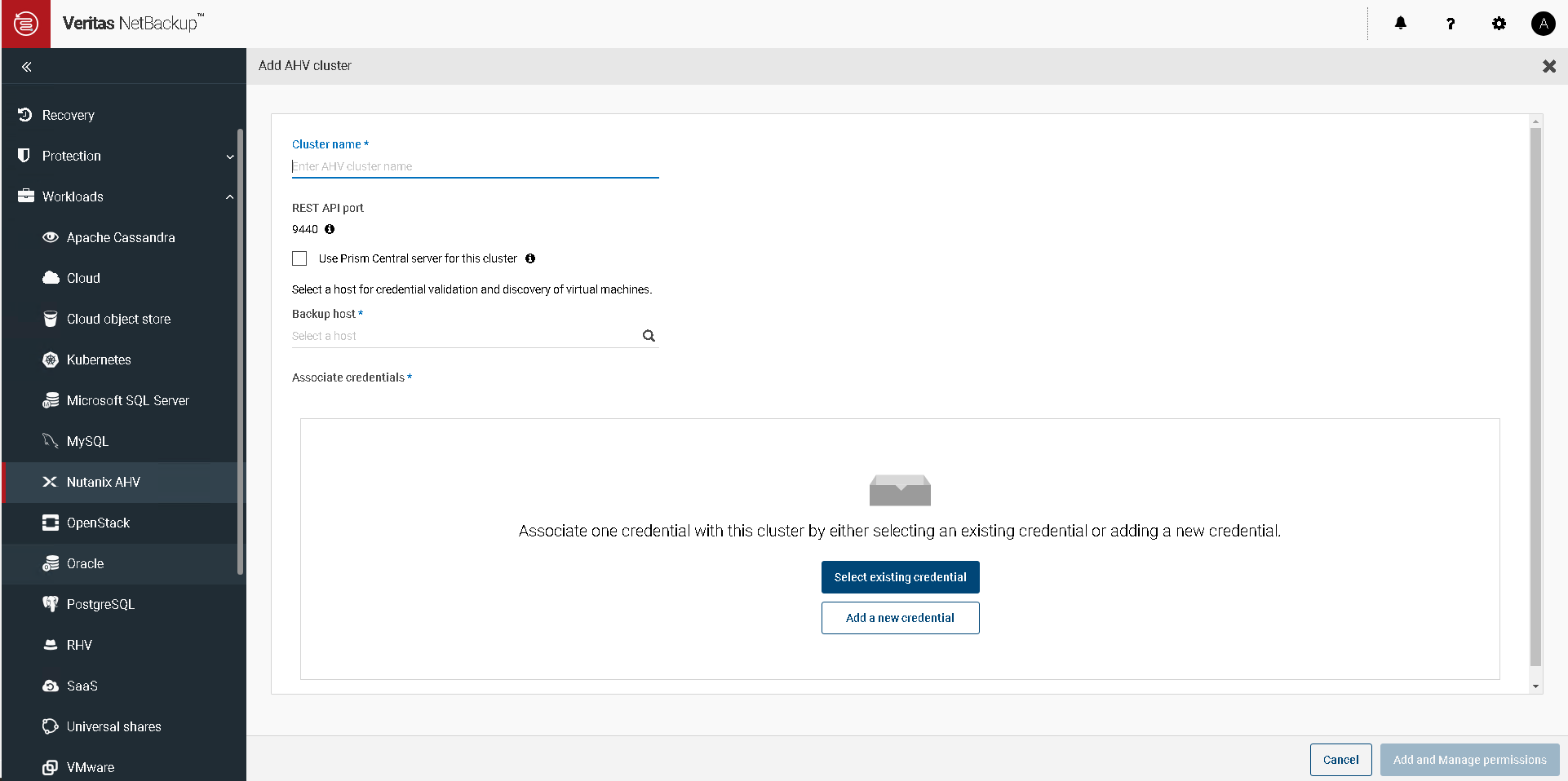 • Specify Nutanix Cluster IP, Specify Backup host and add a new credential.