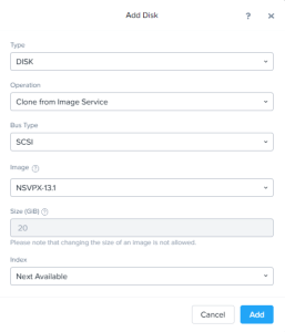• Click Add Disk , Select Clone from Image Service and select the Citrix NetScaler Image and click add