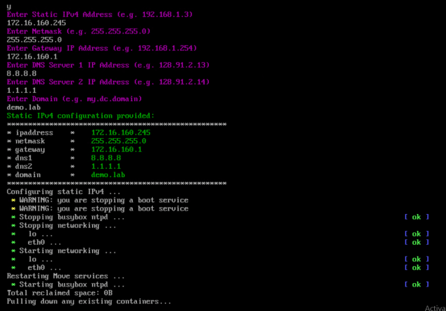 Specify the IP Adress, Netmask, Gateway, DNS and domain and enter. Once IP is configured. Move can be accessible from any web browser.