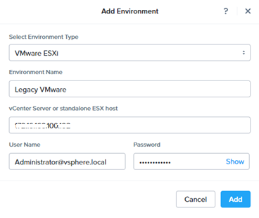 Provide environment name, IP address, Username , Password and click add