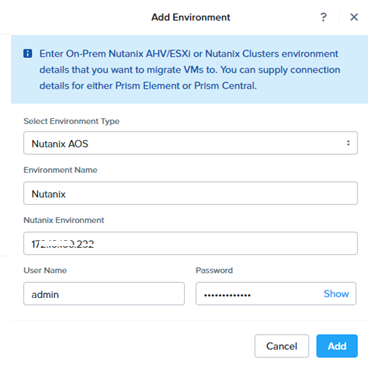 Nutanix Target (AHV /VMware) will be added as Nutanix AOS. Provide Nutanix Cluster IP, username and password and click ADD.