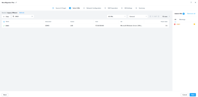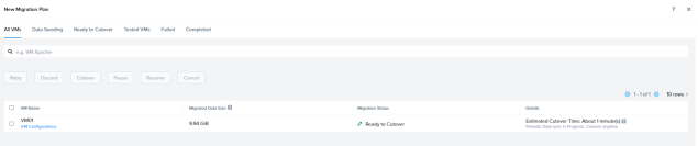 Select the VM and Click Cutover. During cutover Source VM will be shutdown and final sync will be initiated. Source VM NIC will be disconnected and New VM will be registered in Nutanix and powered-on