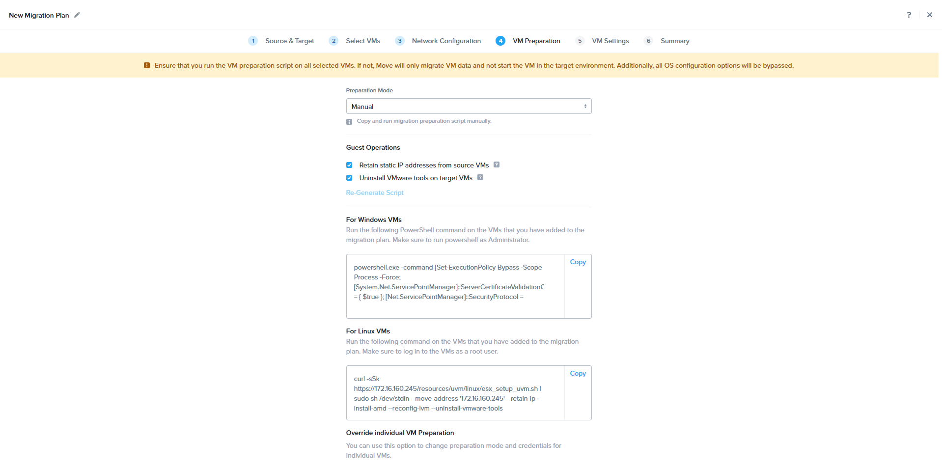 In the manual Preparation method, based on the OS type above mentioned commands need to be run manually.