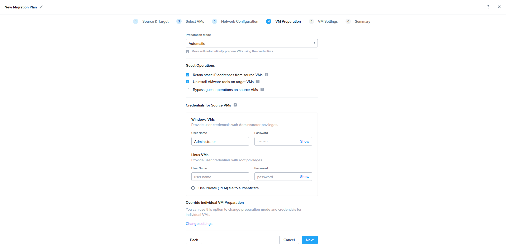 Provide Guest VM Admin permission to do the Automatic VM preparation and click next.