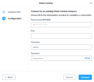 Specify the Prism Central IP , Username and Password and click Connect