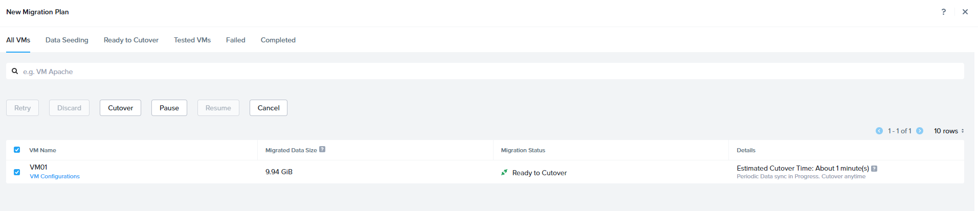 Once the Sync is completed, job status will be shown as Ready to Cutover.