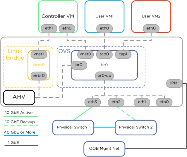 Bridges act as virtual switch to manage traffic between physical and virtual network interfaces. By default AHV configuration includes an OVS called Br0 / Br0-up and a native Linux Bridge call Virbr0. The virbr0 Linux bridge is responsible for management and storage communication between CVM and AHV host. All the other traffic (storage, host, VM) flows through br0 OVS bridge.